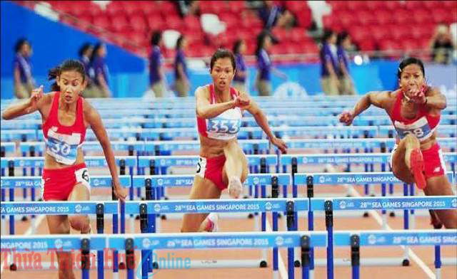 Yến Hoa (giữa) - VĐV điền kinh Huế tranh tài và giành HCB 100 m rào nữ tại SEA Games 28