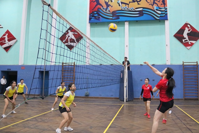Trận đấu giữa đội bóng chuyền nữ Trường ĐH Sư phạm (đỏ) và Trường ĐH Y dược