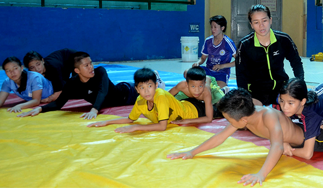Ngay khi trở về từ ASIAD 18, Mỹ Hạnh (áo đen) lập tức bắt tay vào tập luyện và hướng dẫn cho các VĐV đàn em