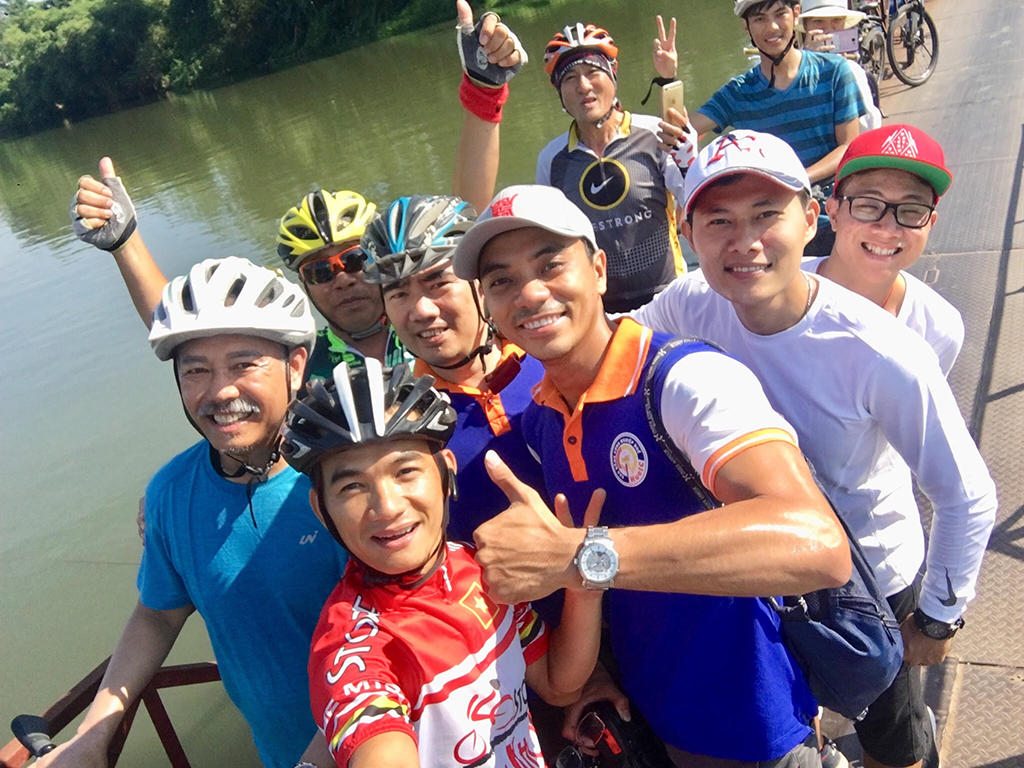 Anh Khoa (áo đỏ) cùng những người đồng sở thích ghi lại kỷ niệm tại cầu phao Lăng Gia Long