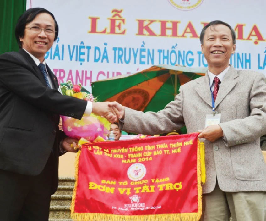 Ông Phan Bình (trái) nhận cờ lưu niệm của BTC giải việt dã truyền thống toàn tỉnh tranh cúp Báo Thừa Thiên Huế 2014