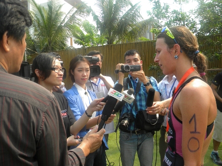 Radka Vodickova liên tiếp giữ chức vô đích cuộc đua ba môn phối hợp Laguna Lăng Cô-Vietnam Airlines (2013-2014) trả lời với phóng viến báo chí về cảm nhận cuộc đua sau khi về đích