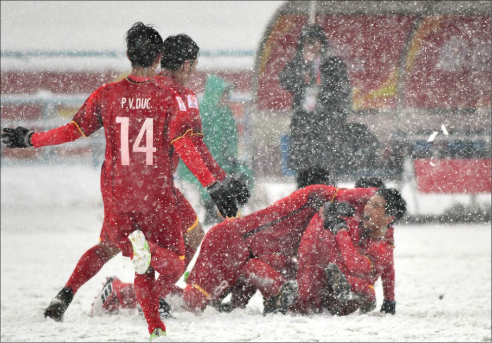 Nhưng ngoạn mục nhất, “bom tấn” nhất chính là trận chung kết lịch sử trên mặt sân Thường Châu phủ đầy tuyết trắng, dưới cái lạnh 0 độ C. Ở đó, các chiến binh áo đỏ, tóc xanh phủ đầy tuyết trắng đã chơi một trận đấu sống mái với U23 Uzbekistan đến 120 phút. Và phút 119 định mệnh, U23 Việt Nam đã bị thủng lưới. Bàn thắng đến vào phút cuối trận đấu quá nghiệt ngã và cũng đầy tức tưởi cho những nỗ lực của Nguyễn Quang Hải và các đồng đội. Nhưng như chúng tôi đã nói, hành trình của U23 Việt Nam như một bộ phim “bom tấn” . Nếu U23 Việt Nam thắng thì đã quá tuyệt vời rồi và ai cũng mong chờ điều đó; nhưng trận thua như trận chung kết chiều 27/1 trên một sân đấu băng giá như thế đã là một kịch bản phim quá hoàn hảo...
