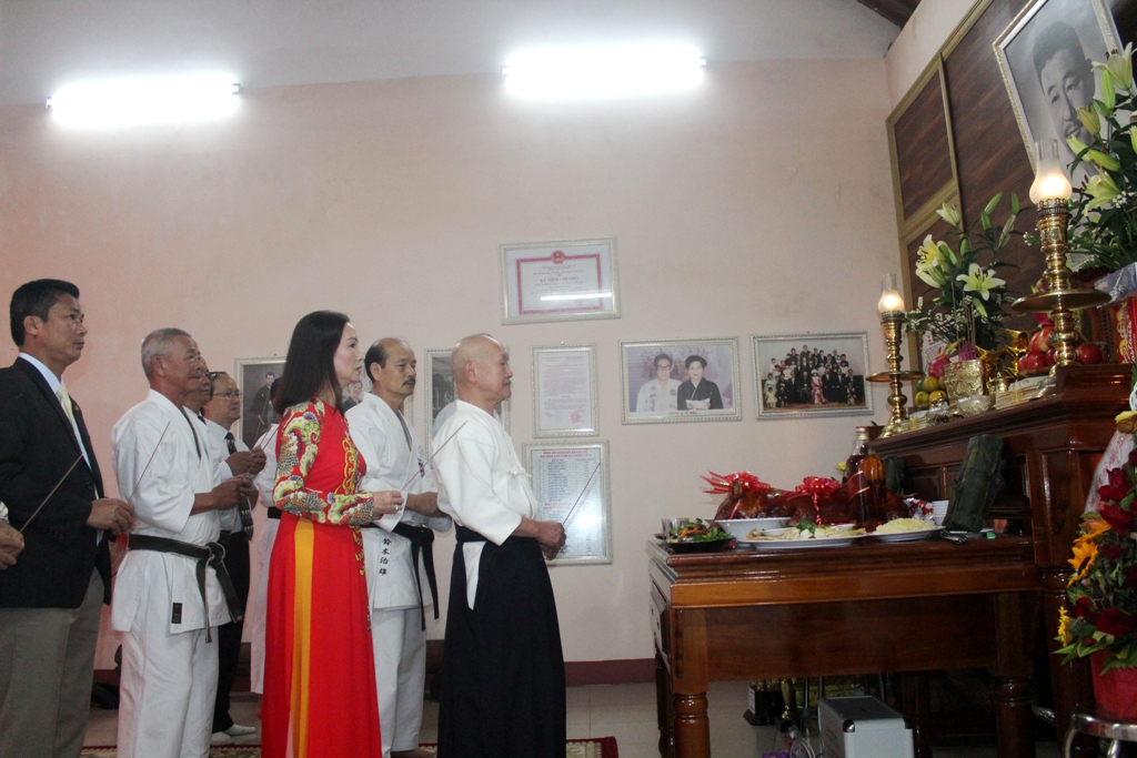 Chưởng môn Tokuo Suzuki (hàng đầu) và bà Michiko Suzuki (áo dài đỏ) cùng các cao đồ, lãnh đạo ngành TDTT dâng hương lên người sáng lập hệ phái Suzucho Karatedo.