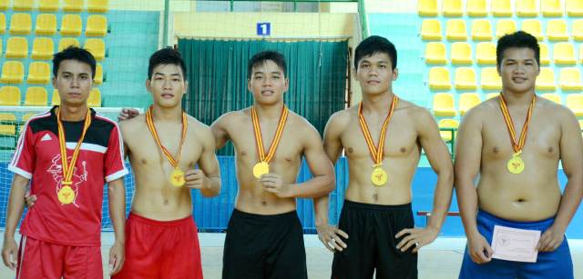 Các VĐV đạt HCV tại giải vật dân tộc ĐH TDTT tỉnh 2014 cũng chỉ là những gương mặt quen thuộc. Từ trái qua: Nguyễn Văn Tuấn hạng 50kg, Nguyễn Mạnh Tấn hạng 57kg, Lê Phương Long hạng 65kg, Đặng Văn Phước hạng 70kg, Hồ Đăng Trọng Khánh, hạng trên 70kg