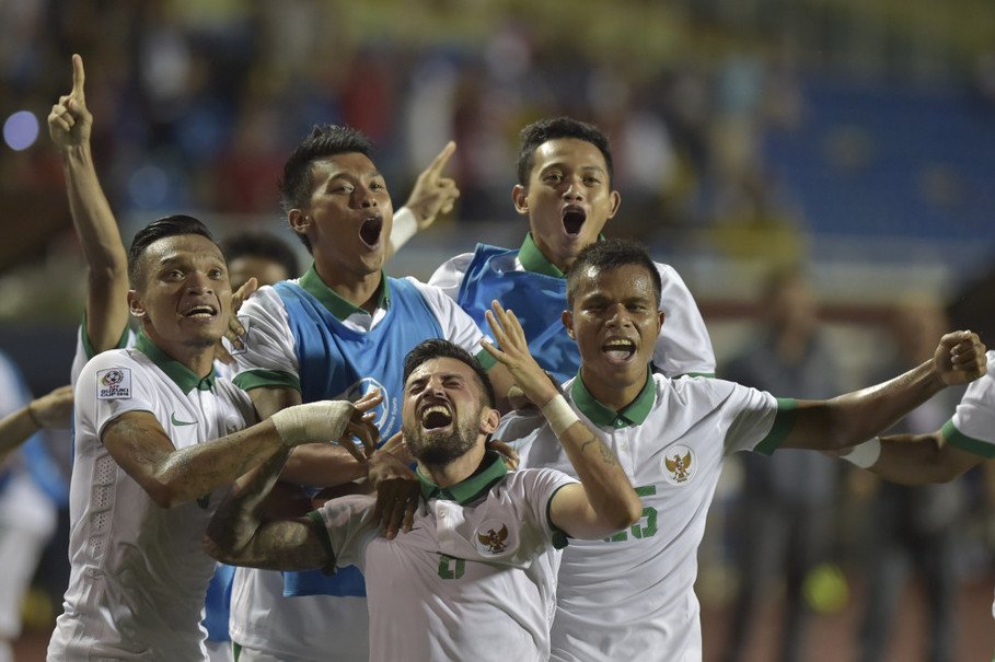 Niềm vui của cầu thủ Indonesia sau khi lách qua cửa hẹp vào bán kết