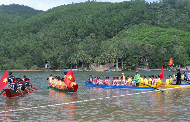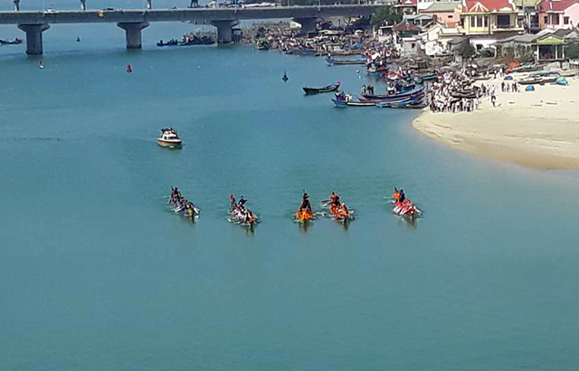 Các đội đua tranh tài tại lễ hội đua thuyền truyền thống ở vịnh Lăng Cô (Ảnh: Đăng Trung)
