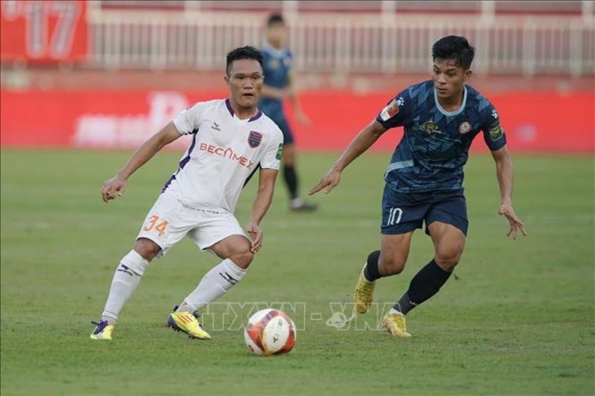 | Pha tranh bóng của cầu thủ đội bóng Câu lạc bộ TP Hồ Chí Minh (áo xanh) và Becamex Bình Dương (áo trắng). |