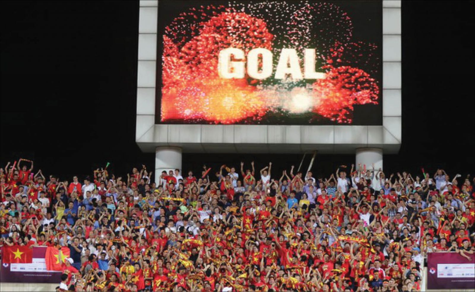 Sân Mỹ Đình bùng nổ sau pha làm bàn của Quang Hải vào lưới Malaysia. Ảnh: Tienphong.vn