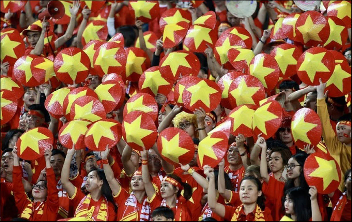 Một nhóm CĐV mang theo nón lá in hình ngôi sao vàng - Những Ngôi Sao Vàng là biệt danh của tuyển Việt Nam. Ảnh: VnExpress
