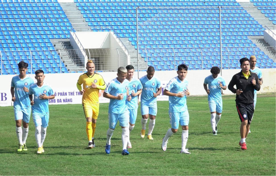 Các cầu thủ Đà Nẵng khởi động trong ngày đầu tiên hội quân. Ảnh: ĐNFC
