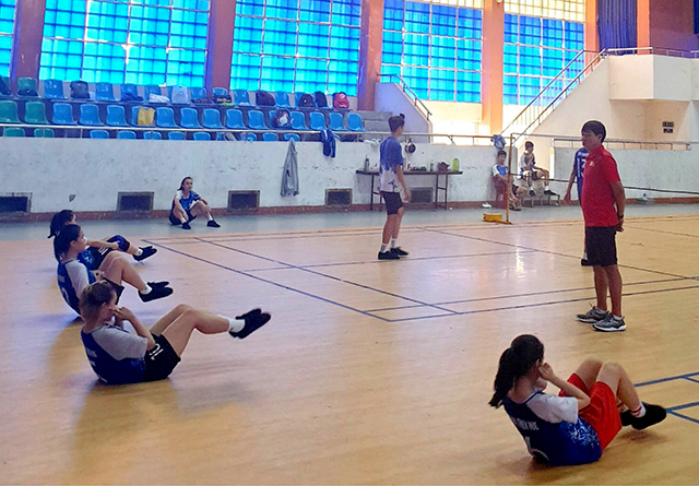 Số VĐV tuyển đá cầu tập luyện ít hơn và giữ khoảng xa hơn ngày thường. Ảnh: HÀN ĐĂNG
