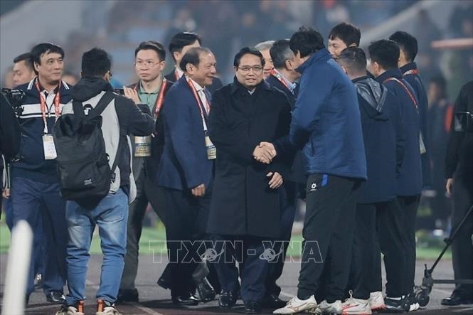 | Thủ tướng Phạm Minh Chính xuống sân chia vui với đội tuyển Việt Nam. Ảnh: Minh Quyết/TTXVN |