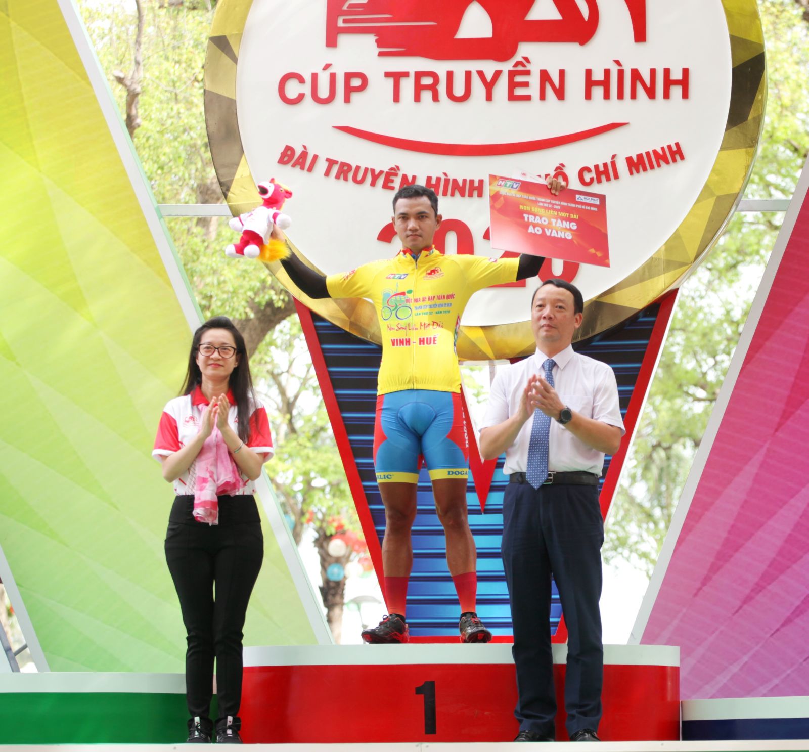 Phó Chủ tịch UBND tỉnh - Phan Thiên Định (phải) trao thưởng và mặc áo vàng cho Nguyễn Tấn Hoài - VĐV về nhất chặng 3: Quảng Bình - TP. Huế