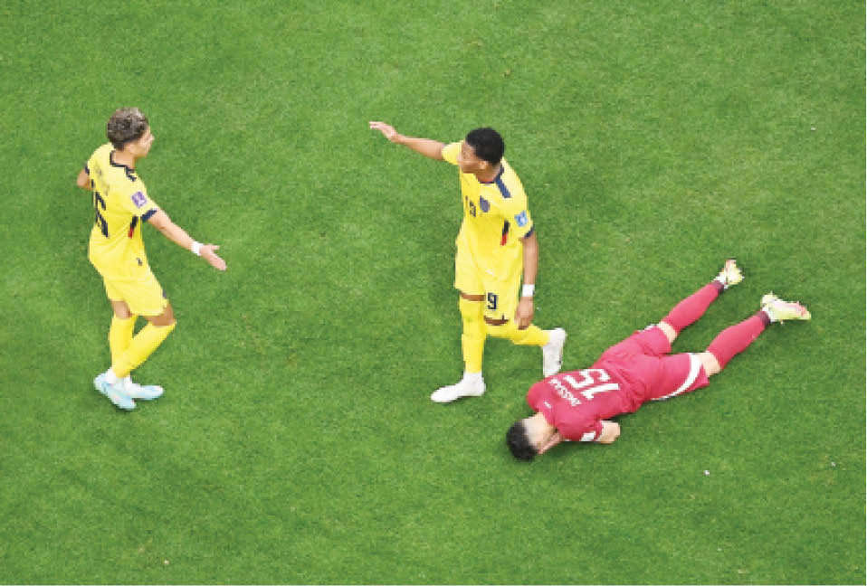 Qatar (áo đỏ) lập kỷ lục buồn là nước chủ nhà đầu tiên trong lịch sử toàn thua ba trận. Ảnh: AFP