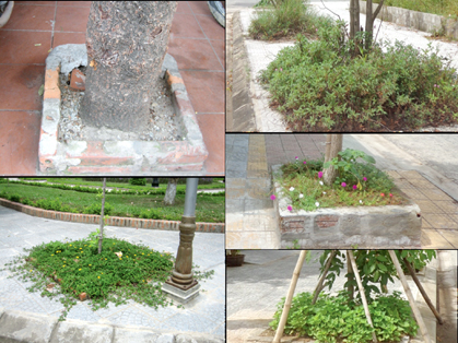 Qua khảo sát một số đường phố ở thành phố Huế, chúng tôi thấy kiểu xử lý mặt hố trồng cây xanh trên vỉa hè đường phố rất đa dạng. Về kiểu dáng bó vỉa mép hố, có nơi mép hình vuông, có nơi hình tròn... Về độ cao mép hố, có nơi ngang mặt vỉa hè, có nơi cao 5-7 phân cho đến vài tấc, thậm chí có nơi cao 40-50 phân...; vật liệu bó vỉa mép hố cũng đủ loại, nào là gạch đặc, gạch lỗ, nào là bờ-lô...
