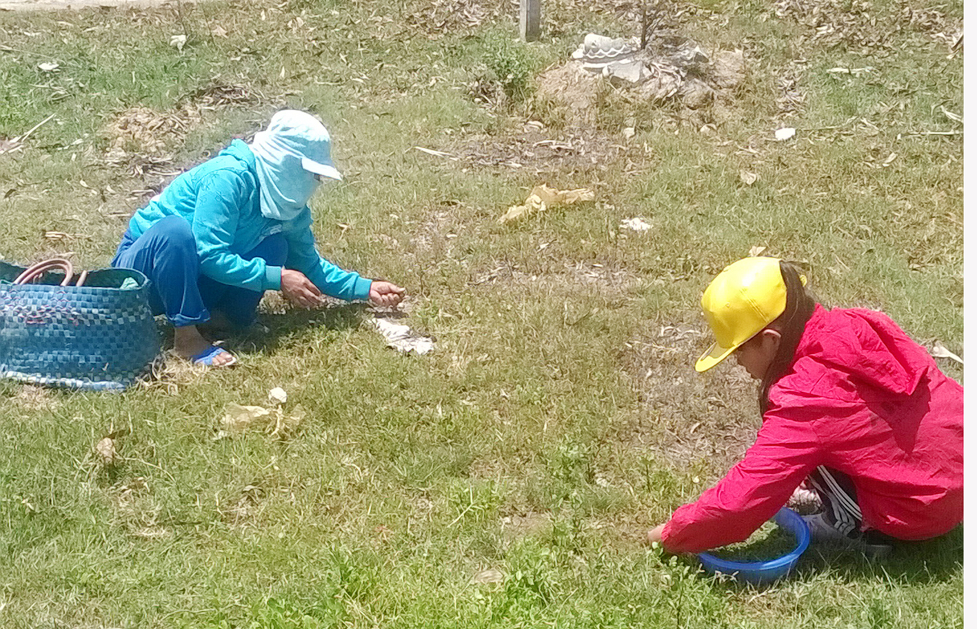 Mẹ con chị Bình hái từng nhánh rau muối giữa nắng trưa gay gắt