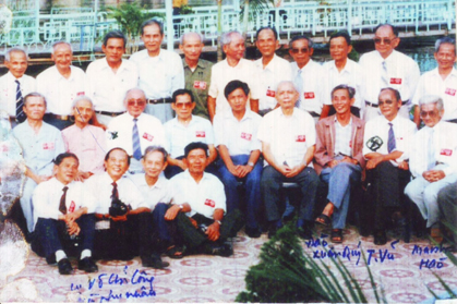 Nhà văn Thái Vũ và các đồng đội trong dịp kỷ niệm 50 năm Trường Trung học Bình dân Quân sự Liên khu 5 (Trong ảnh: Hàng thứ hai, từ phải qua: Người thứ 2 là Thái Vũ, người thứ 7 là nguyên Chủ tịch Nước Võ Chí Công - Hồi đó ông là học viên với tên Võ Toàn; còn Thái Vũ là giáo viên)