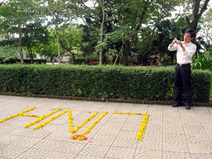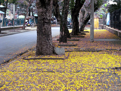 Giữa trưa nắng, bác xe ôm ngủ quên sau những cuốc xe vất vả tỉnh giấc ngỡ ngàng khi thấy quanh mình một màu vàng miên man. Hoa để lại những hình hài không thể gọi tên trên mặt đất khi những vật thể tạm trú chân dưới tán cây rời đi. Nhìn phố như thể một tác phẩm nghệ thuật sắp đặt của nghệ sĩ tự nhiên… Chợt nhớ đến một bài hát về hoa với hình ảnh đầy ấn tượng: Cây điệp vàng, trước nhà em mỗi tối/Sắc hoa vàng rụng xuống kín chân tôi… Em có thấy một mai khi thức dậy/ Hai dấu chân tôi để lại trước sân/ Lòng tôi đấy yêu mà không dám ngỏ/ Xác hoa vàng sẽ nói hộ giùm tôi.