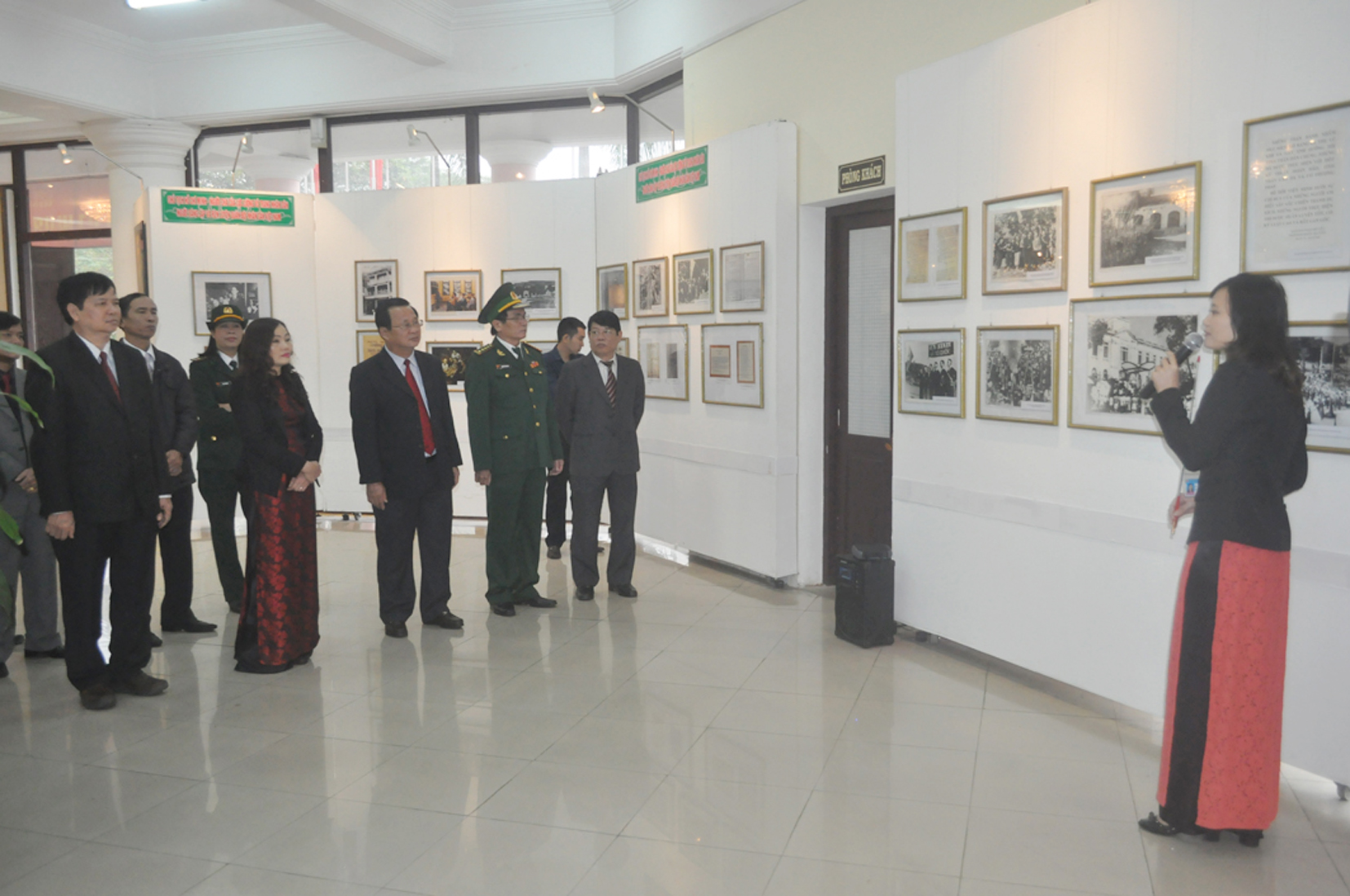 Các đại biểu nghe giới thiệu về các tư liệu, hiện vật quý được trưng bày tại triển lãm