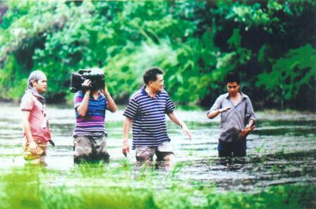 Đạo diễn, NSƯT Trần Vịnh (thứ 2 từ phải sang) cùng đoàn làm phim trong cảnh quay của “Huế - Mùa mai đỏ”
