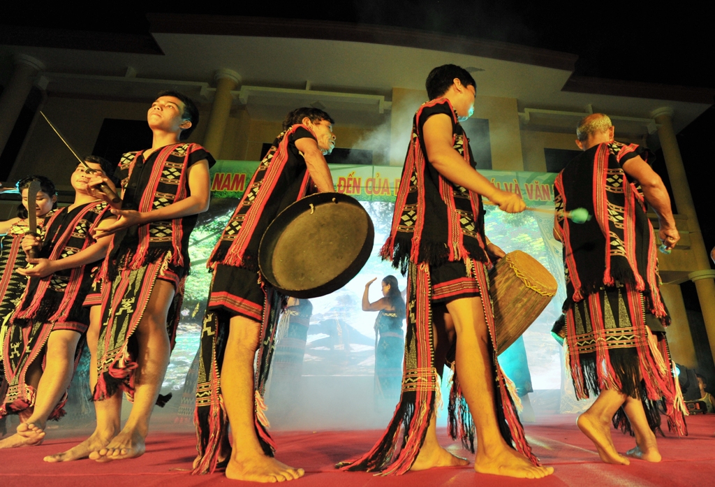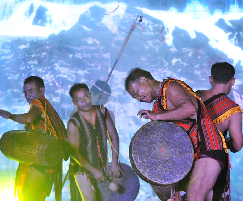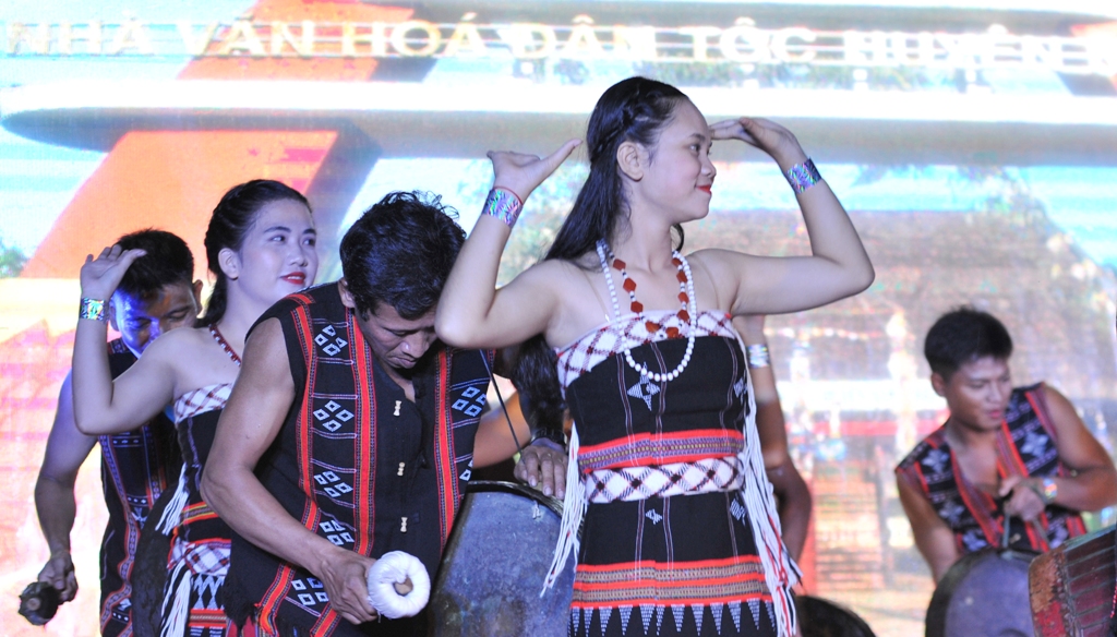 Phối hợp với những điệu múa, âm vang cồng chiêng càng thu hút người xem