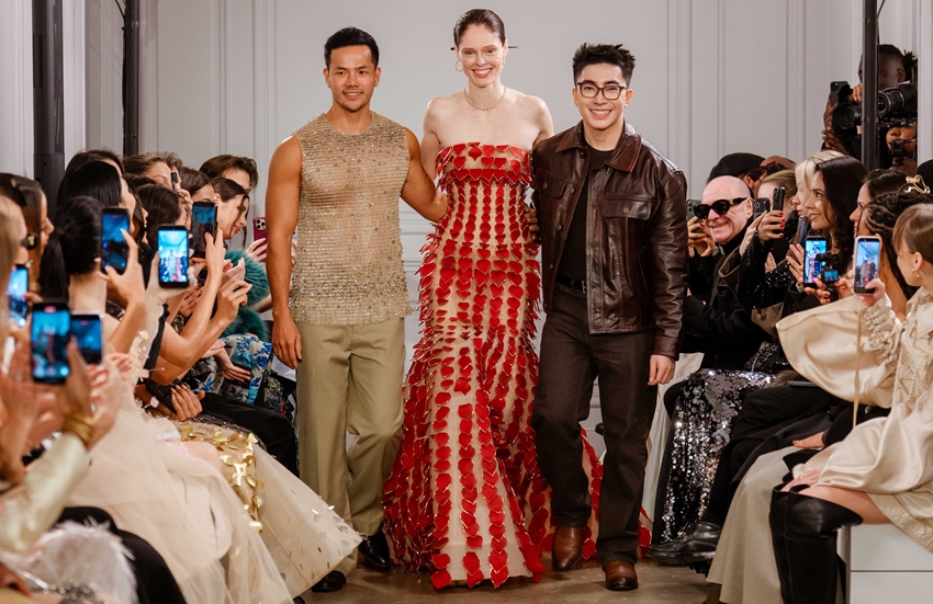 | NTK Phan Huy (phải) và stylist Steven Đoàn cùng người mẫu trình diễn tại Haute Couture Week. |