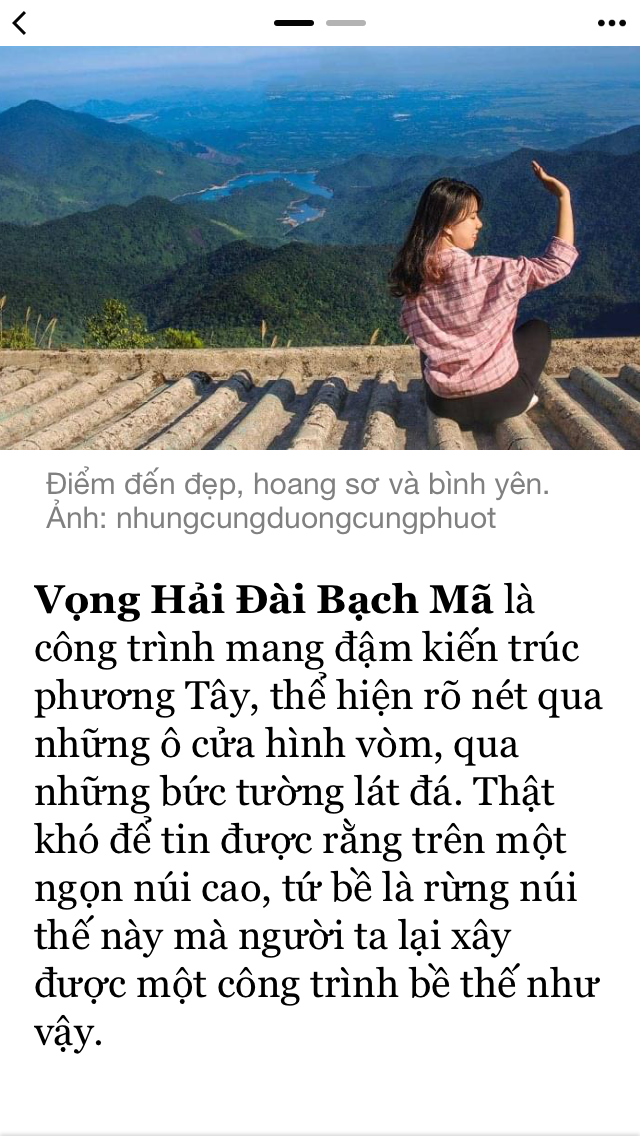 Chưa kịp ngao ngán thì liền đó là: “Trên đỉnh núi Ngũ Hành Sơn thuộc dãy Bạch Mã có một biệt thự bỏ hoang mang tên Vọng Hải Đài (VHĐ)”; Tiếp theo còn bày đường đi một cách “rất tọ vẹ”: “VHĐ cách trung tâm thành phố Đà Nẵng 10 Km. Du khách có thể đến đây theo đường Lê Văn Hiến, sau đó rẽ Huyền Trân Công Chúa…”. Vậy là từ VHĐ Bạch Mã, tác giả chỉ đường cho khách lên VHĐ Ngũ Hành Sơn chăng?!!. Nhưng không, xuống mấy dòng lại thấy “con đường mòn dẫn lên VHĐ được xem là dễ nhất trong số nhưng cung đường của vườn quốc gia Bạch Mã.”. Đúng là còn tệ hơn cả sự nhầm lẫn nữa. Đây không thể gọi gì khác hơn là một sự tưởng tượng ngô nghê, xuyên tạc và vô cùng thiếu kiến thức của tác giả. Tuy thế, đó chỉ mới là một ít trong số rất nhiều thông tin tào lao của bài viết. Dân Huế và những ai biết về Bạch Mã đọc vào đều không thể nén được buồn cười xen cả sự phẫn nộ; còn người chưa biết mà đọc thì chắc chắn không tránh khỏi bị “đầu độc” về mặt kiến thức. Chưa kể bài viết còn được minh họa cùng nhiều bức ảnh của Bạch Mã, với những chú giải thiếu chính xác, thậm chí phản cảm. Như VHĐ do người Pháp xây, kiến trúc đậm nét châu Âu, nay bỏ hoang xuống cấp…. Thực tế lầu bát giác 2 tầng đang hiện hữu ở VHĐ là công trình mới được xây dựng (hoặc phục dựng (?)) sau này, còn trước đó, ít nhất là vào những năm 1990, khi đến đây chúng tôi không thấy một “biệt thự bỏ hoang” nào như bài viết mô tả cả. Lại nữa, khu vực mái của lầu bát giác trên VHĐ từ lâu đã có biển cấm không được leo trèo chụp ảnh bởi dễ mất an toàn thì vẫn được check-in và đưa vào minh họa cho bài viết, một sự khuyến khích rất phản cảm!