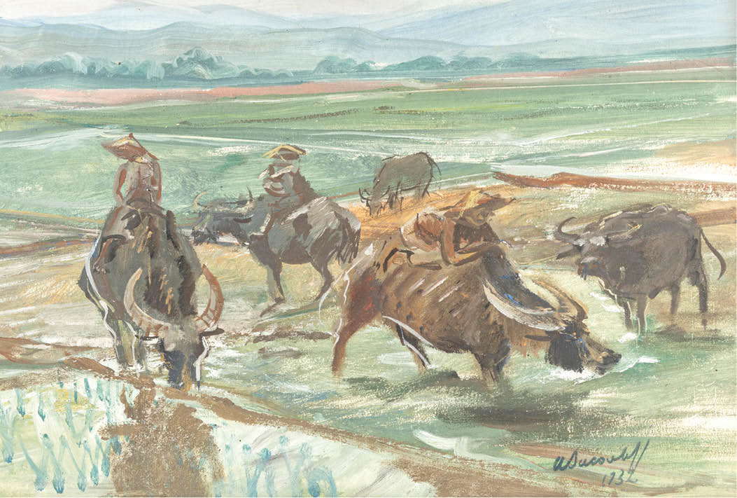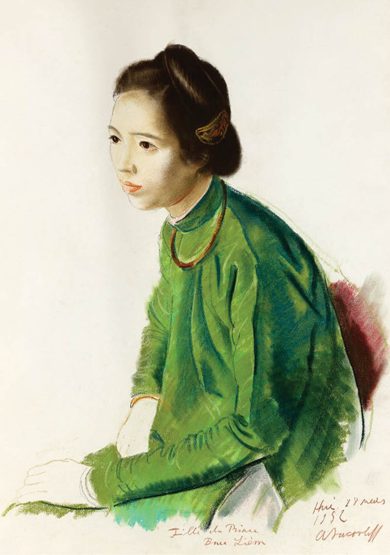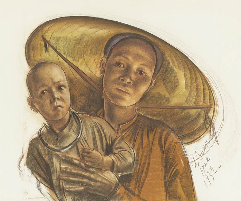 Với Huế, ông có mấy bức chân dung đặc sắc. Ông vẽ hoàng tử Bửu Liêm (Hoài Ân vương), em vua Thành Thái và vẽ cô công chúa - con gái của ngài. Cả hai được vẽ với kích thước 76,5 x 56,5cm, bằng phấn tiên và chì màu trên giấy, như cách ông thường vẽ nhanh các chân dung và đều rất sống động. Riêng bức “Mẹ và con” thể hiện bà mẹ với đứa con đeo kiềng, cả hai đều có vẻ buồn bã, không rõ tác giả đã vẽ ai và trong dịp nào. Tranh cũng vẽ bằng phấn tiên và chì màu trên giấy, kích thước 56 x 66,5cm; được đưa ra đấu giá ngày 12/4/2011 tại nhà Sotheby's New York, với giá khởi điểm rất cao đối với một bức tranh giấy khổ nhỏ: 100.000 - 150.000 USD.