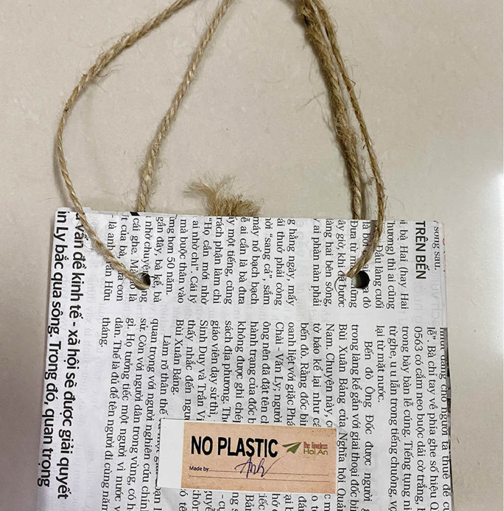 Chiếc túi đựng hàng lưu niệm từ giấy báo ở Hội An với thông điệp “không nhựa”