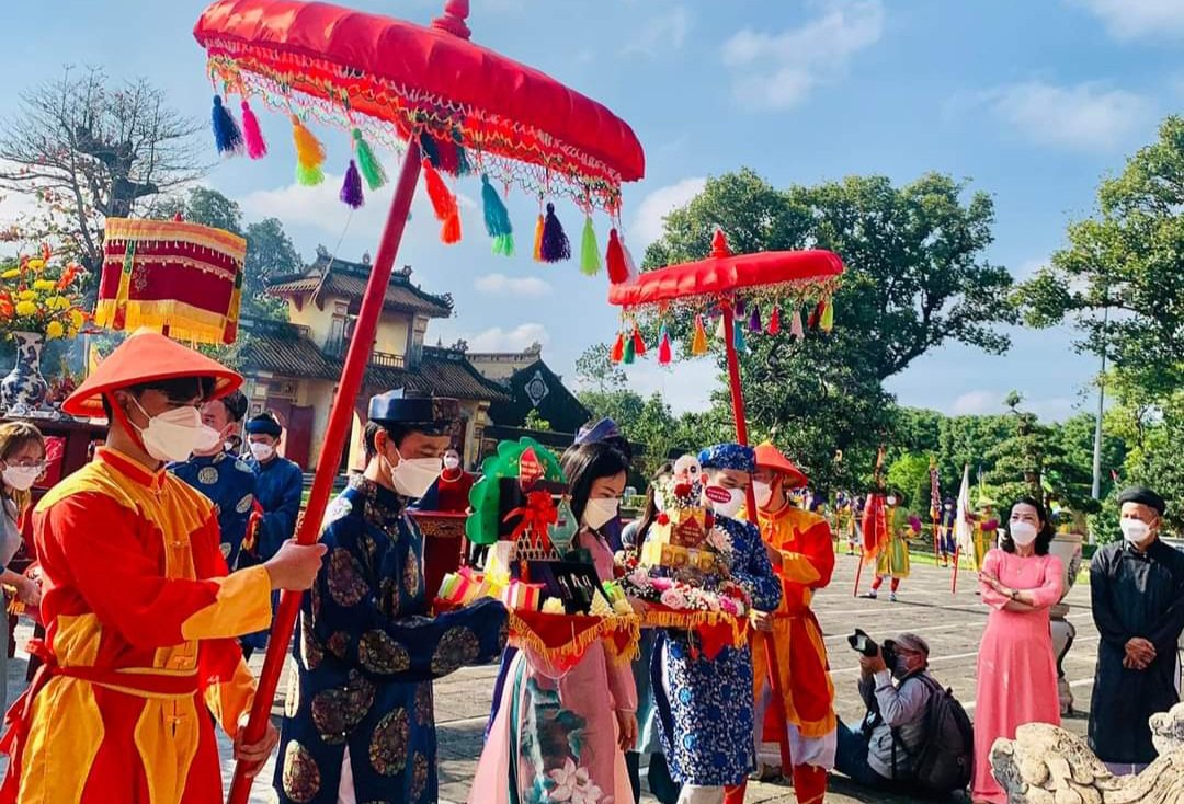 HNN.VN - Trong khuôn khổ Không gian giới thiệu sản phẩm tiêu biểu, đặc sản địa phương Tết Nhâm Dần 2022 tại Phố đêm Hoàng Thành Huế, sáng 26/1 Ban tổ chức phối hợp với Trung tâm Bảo tồn Di tích Cố đô Huế tổ chức đoàn rước phong vị sản vật địa phương “Dâng tiến Hương Xuân”.