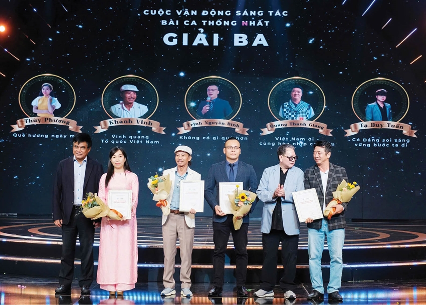 | Nhạc sĩ Thùy Phương (thứ 2 trái sang) nhận giải Ba cuộc thi sáng tác “Bài ca Thống nhất” |