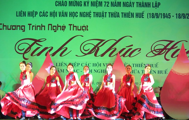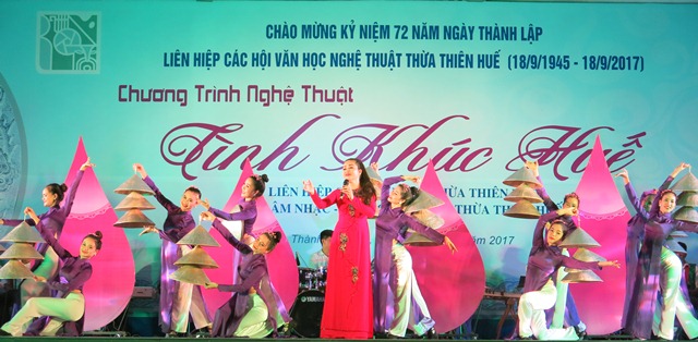 HNN.VN - Diễn ra tối 18/9 tại tiền sảnh Trung tâm Văn hóa Thông tin tỉnh, chương trình nghệ thuật “Tình khúc Huế” mang đến cho khán giả những giai điệu mượt mà, sâu lắng về Huế. Đây là hoạt động chào mừng 72 năm Ngày thành lập Liên hiệp các Hội VHNT (18/9/1945-18/9/2017) do Liên hiệp các Hội VHNT, Hội Âm nhạc, Hội Nghệ sĩ múa tỉnh tổ chức.