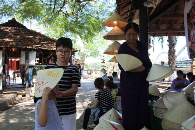 Thay vì la cà các quán cà phê tán gẫu với bạn bè vào ngày nghỉ như thường lệ, kì nghỉ 30/4 này anh Tín (ở Nguyễn Lương Bằng, TP. Huế) dẫn hai “nhóc” thăm thú các gian trưng bày của festival làng nghề truyền thống. Không rời mắt khỏi những chiếc nón lá nhỏ, xinh xắn, cô bé Ngân Khánh (4 tuổi) cuối cùng cũng chọn cho mình được một chiếc nón “tí hon” ưng í. Anh Tín chia sẻ, hầu như kỳ festival nào anh cũng dẫn các cháu đi xem, giới thiệu cho các cháu về các làng nghề. Không những thích thú với những sản phẩm mới lạ, các cháu còn rất tò mò muốn tìm hiểu về nguồn gốc, xuất xứ của chúng.