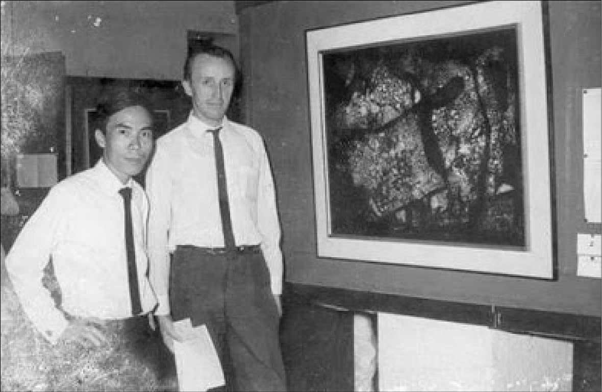 Họa sĩ Đinh Cường (trái) và tác phẩm “Trăng qua vùng động đất” được bán cho nhà sưu tập Đức, ông Erich Wulff tại Huế Năm 1966.