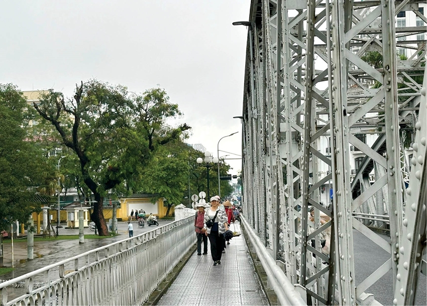 | Du khách dạo bộ qua cầu Trường Tiền |
