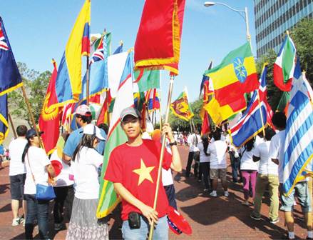 Tác giả (cầm cờ Việt Nam) trong một sinh hoạt ngoại khóa của giới trẻ bên dòng Potomac.