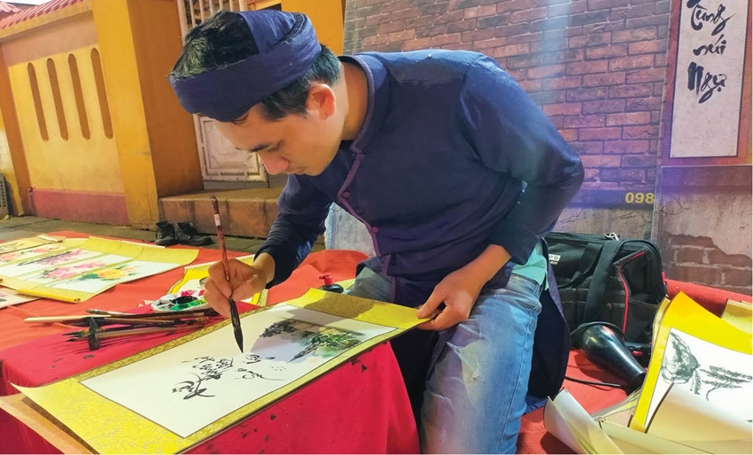 | Lê Duy Ngọc viết thư pháp ở phố đi bộ ở đường Chu Văn An - Huế |
