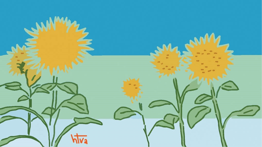 Nhìn qua ô cửa nhỏ, trước mắt tôi là con đường đất màu son, hàng cây lưu niên nghiêng nghiêng nhưng vững vàng đón gió. Xa xa, mặt trời màu hoa hướng dương đang dần lên cao. Trời đất sáng quang điểm xuyết vài áng mây xanh trong trẻo.