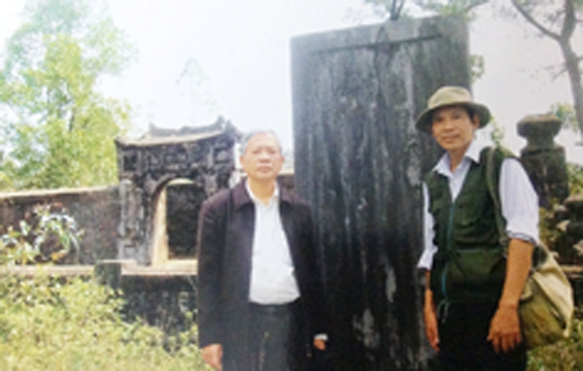Tác giả Hồ Vĩnh (bên phải) và nhà thơ Nguyễn Khoa Điềm trước bia đá cổ. Ảnh: Bửu Nam