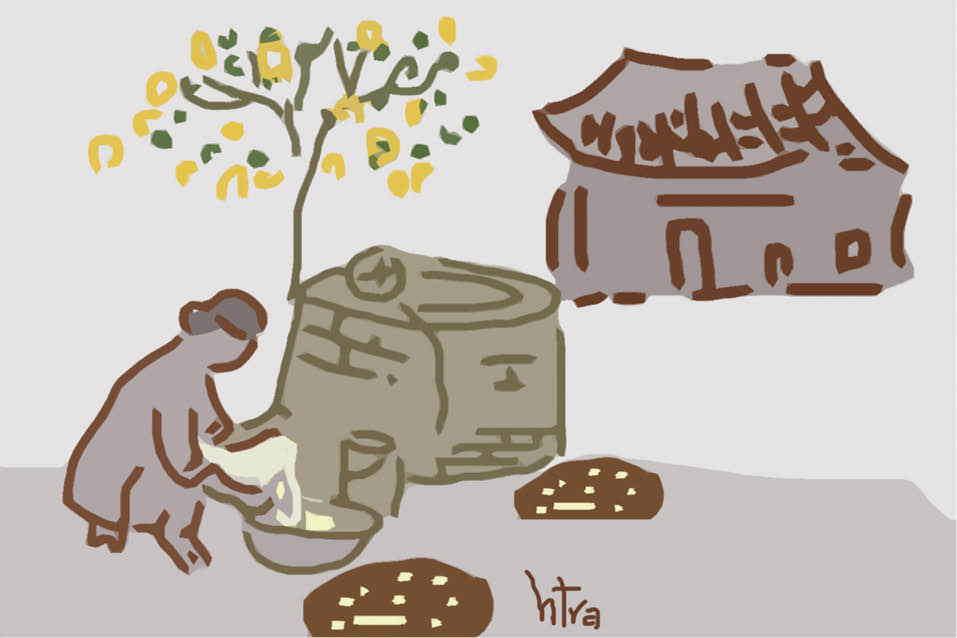 Có giếng khơi là sẽ có giàn rau trái phủ xanh quanh năm. Mùa nào thức ấy, mẹ ươm đủ loại dây leo, nào bầu, bí, mướp, su su, đậu ván... Dưới giàn cây xanh mướt, nhịp sống thường ngày bên thềm giếng cũng thung dung, nhẹ nhõm hơn. Chẳng biết gì về mạch, nguồn nước, nhưng tôi cảm nhận, dường như mỗi chiếc giếng đều có thân phận riêng. Có giếng nước trong và ngọt, hãm chè xanh rất thơm và đẹp nước, nấu cơm thì đậm vị. Nhưng có giếng nước lại lờ lợ, khó lòng mà ăn uống.