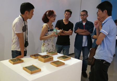 Họa sĩ Tạ Bạch Dương (thứ 2, từ trái sang) giới thiệu tác phẩm của mình với công chúng.