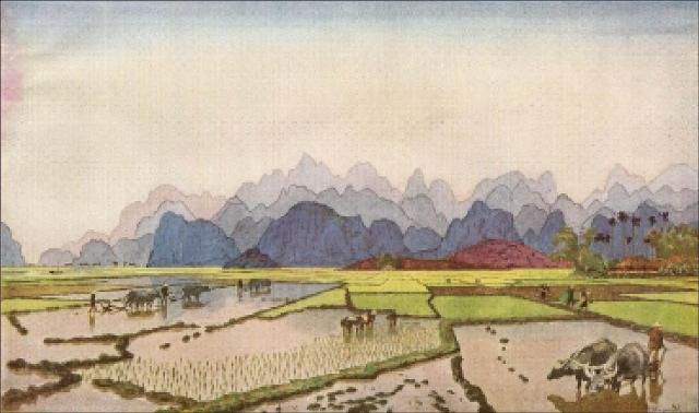 Và tất nhiên, hình ảnh đất nước Việt Nam hiện lên qua khá nhiều bức tranh, trong đó đáng chú ý nhất là “Dãy núi với 99 ngọn” ở Phú Thọ - được tác giả gọi là “Xương sống của con rồng An Nam”...
