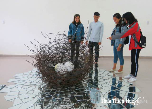ThS. Nguyễn Thanh Tùng, Trưởng Khoa Sư phạm mỹ thuật giới thiệu: “Chất liệu sáng tạo tác phẩm đều do sinh viên nhặt nhạnh ở xung quanh. Tận dụng những mẩu thuốc lá, ly nhựa, tôn, dây thép gai cũ, những tấm gương vỡ, nilon... tưởng như vô dụng, dưới sự hướng dẫn của giảng viên, các em đã sắp xếp, tạo hình khéo léo thành những tác phẩm nghệ thuật 2D, 3D cỡ lớn, phản ánh nhiều chủ đề khác nhau về môi trường sinh thái”.
