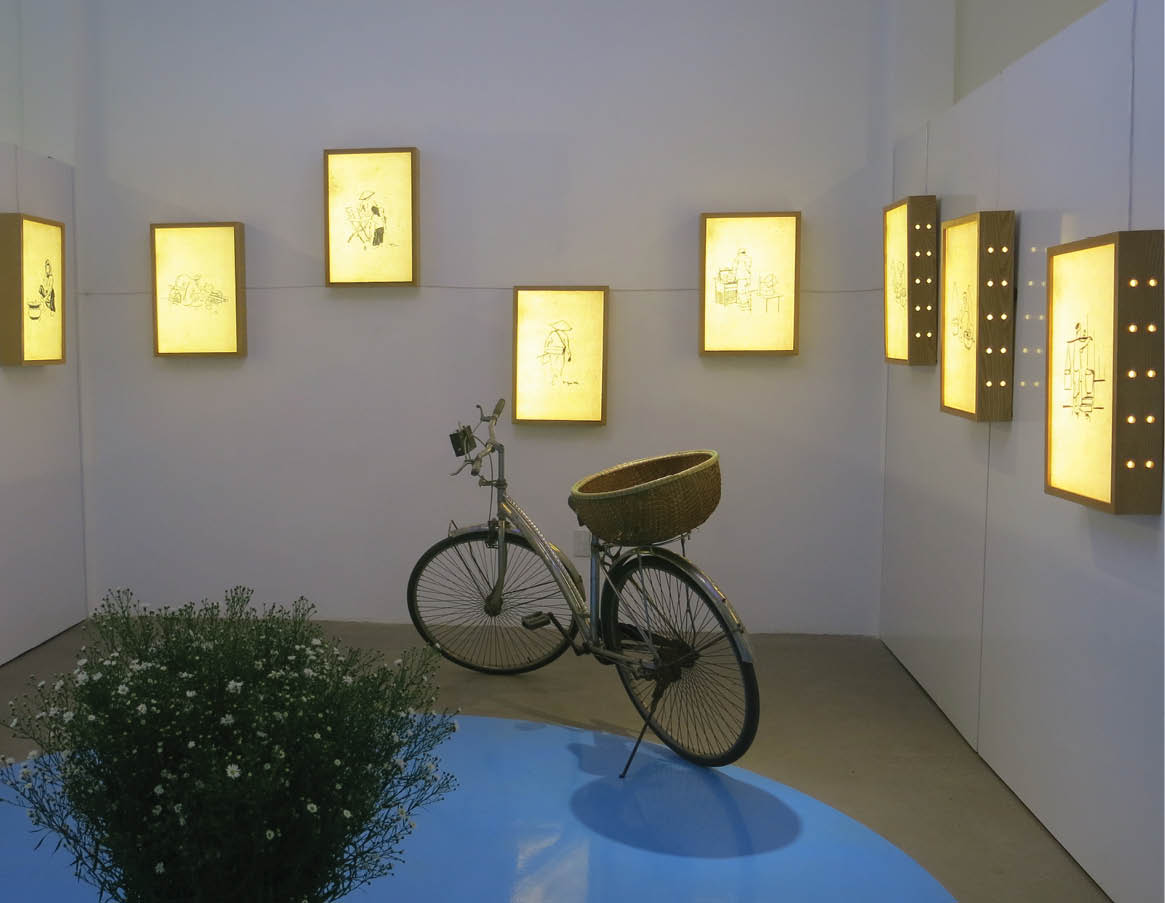 10 bức phác thảo đen trắng trong triển lãm được in trên giấy dó, đưa vào trong các hộp có lắp bóng đèn, khắc họa một cách tài tình thế giới bé nhỏ của những gánh hàng rong đang rảo bước khắp các con phố Hà Nội, dưới tia nắng đầu tiên trong ngày cùng các gánh hàng hoa, rau quả, kẹo bánh và đồ ăn vặt…
