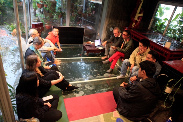 Nghệ sĩ Léopold Franckowiak (người ngồi đầu tiên, bên phải) giới thiệu về tác phẩm của mình