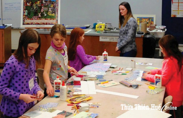 Sau khi hoàn thành xong tour tham quan, các em được đưa đến phòng thực hành sáng tác. Tại đây, giáo sư sẽ trình bày cách thức để thực hiện một tác phẩm nghệ thuật từ các mảnh vải ghép và một số gợi ý nhỏ dành cho chủ đề khá “hot” với cuộc sống hiện đại trong buổi triển lãm này. Chỉ sau 10 phút, mỗi bạn sẽ bắt đầu công việc sáng tác của mình với nhiều ý tưởng khác nhau. Các “mỹ thuật gia tương lai” vừa hì hục tô vẽ vừa trò chuyện với các hướng dẫn viên về các đề tài mình muốn thể hiện một cách say sưa.