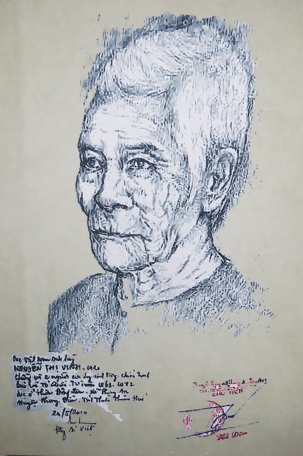 Họa sĩ Đặng Ái Việt vẽ chân dung Mẹ VNAH Kha Thị Yến, dân tộc Thái ở xã Lộc An, Lộc Ninh, Bình Phước