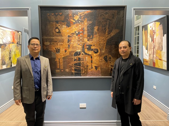 Hai họa sĩ Nguyễn Thiện Đức (trái) và Nguyễn Văn Chuyên (phải) tại triển lãm. Ảnh: NVCC