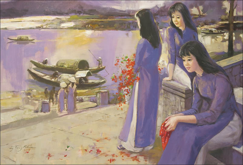 Không vẽ hình ảnh mái tranh, con đò nhưng hầu như bức tranh nào của họa sĩ Nguyễn Trọng Khôi cũng bàng bạc hình bóng của quê hương. Tôi ấn tượng với bức tranh “Mùa thu dịu êm” mà họa sĩ giới thiệu là vẽ về mùa thu ở Việt Nam, đầy cây xanh với không gian tươi mát. Dù không vẽ về dòng sông nhưng bức tranh vẫn gợi về hình ảnh mát lành của thuở tắm sông trong lòng mỗi người.